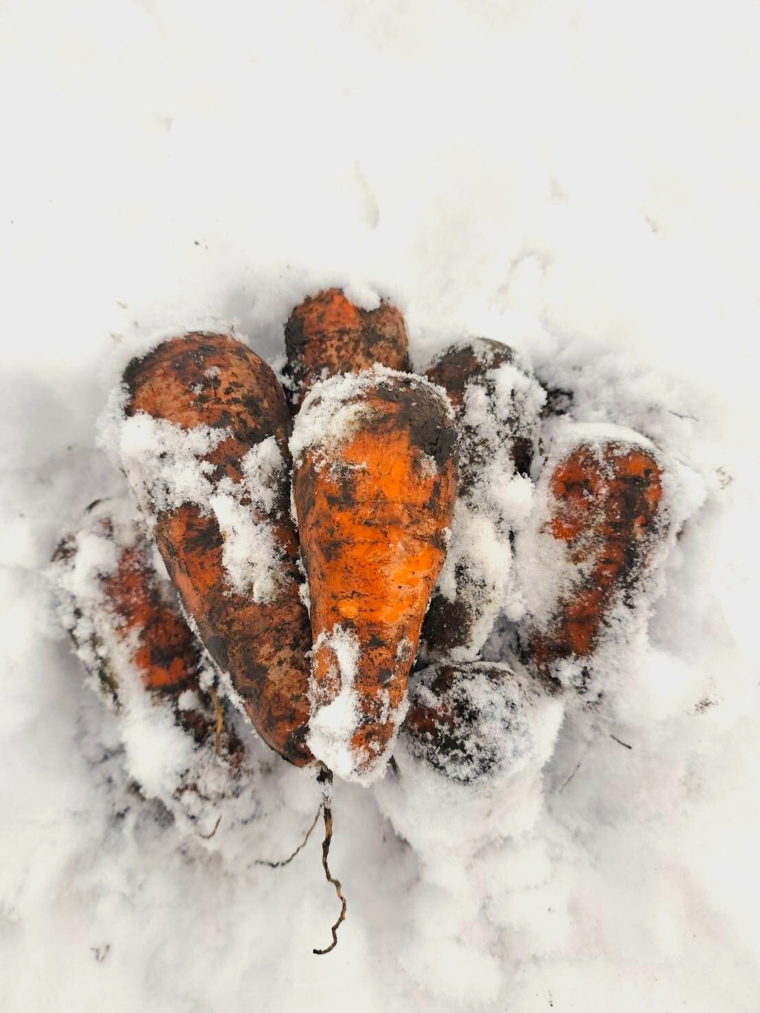 11月から降り積もった雪を手作業でせっせこ掘り返し、甘味をたっぷり蓄えたニンジンを収穫しています。
