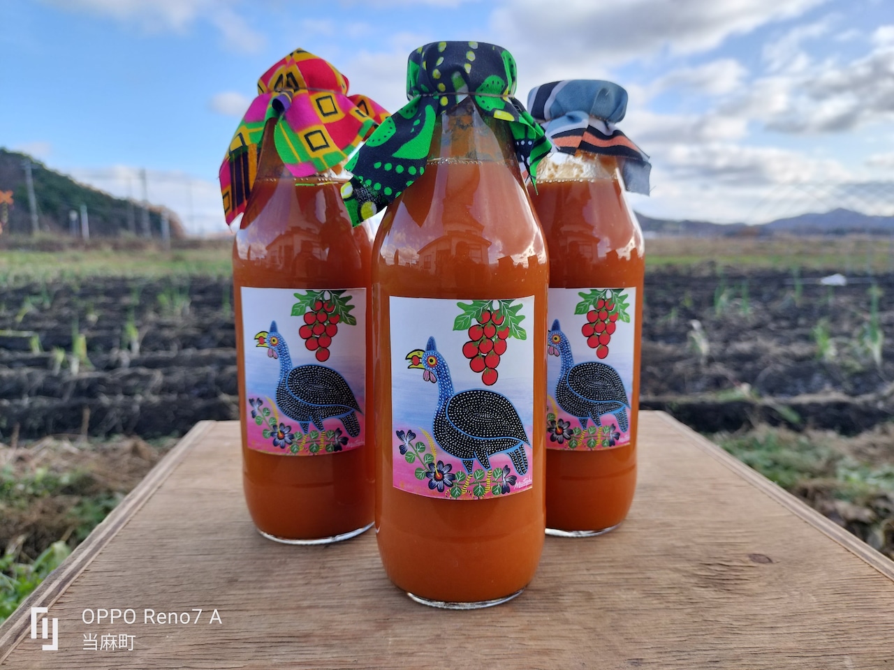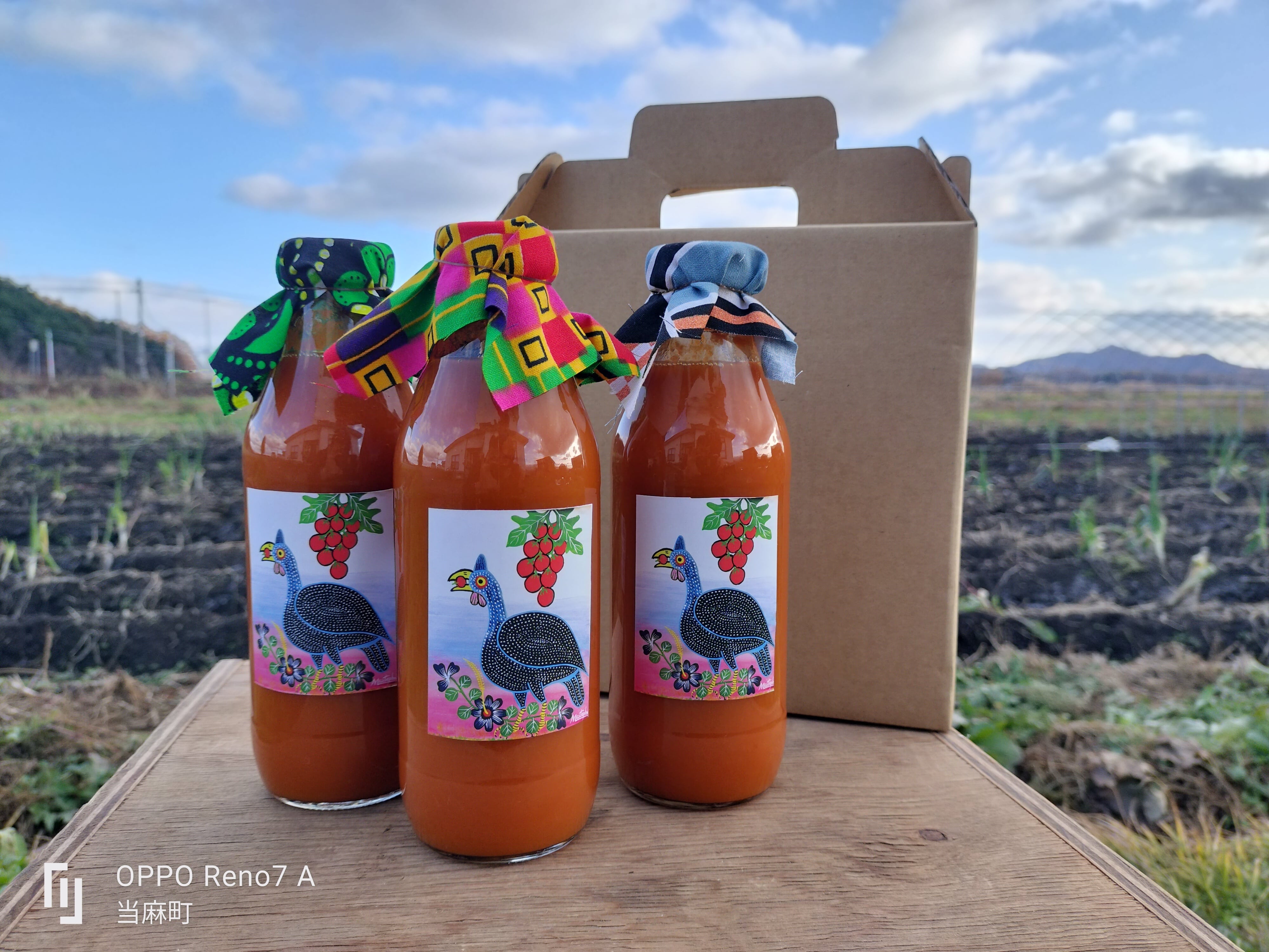 ミニトマトは普通のトマトに比べて皮や種の割合が高いため、ジュースにするにはたくさんの量を必要とします。さらに、当農園のジュースは濃厚さと甘さを追求するために少し濃い目にしているので、500gの量のジュースを作るのに1kg弱程のミニトマトを使っています。ブラッディ・オレンジジュースのような味わいをお楽しみください!